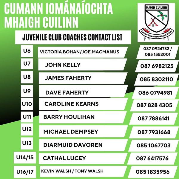 A new hurling season is getting close! We cater for all ages from u6 upwards at all juvenile age groups . All new players at any age are very welcome for the new season. Contact us to try out a session, enjoy and learn the skills of the game as part of a team. All team coaches are listed below and will have details of training slots and times for each group for the year ahead. Looking forward to getting back in action soon!